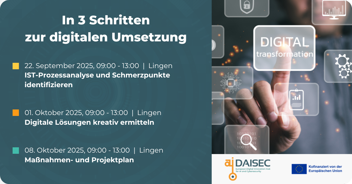 Diese 3-teiligen Veranstaltungsreihe richtet sich an Unternehmen, die ihre eigenen Prozess analysieren, optimieren und für die Digitalisierung vorbereiten wollen. Sie identifizieren Stolpersteine (sog. Schmerzpunkte) in den Prozessabläufen, die es abzubauen gilt, und entwickeln mithilfe kreativer Methoden erste Ideen für digitale Lösungen am “Reißbrett”, die den Prozess unterstützen und effizienter machen.